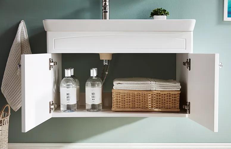 在洗漱盆下也做了一个柜门,便于放一些大件的物品,例如浴巾、纸巾等。