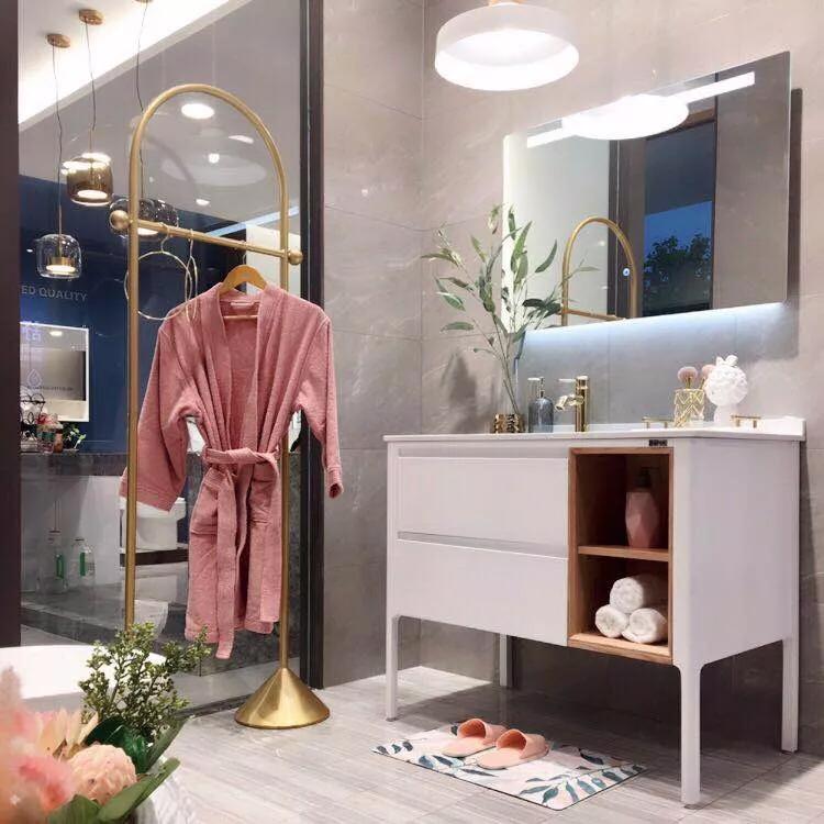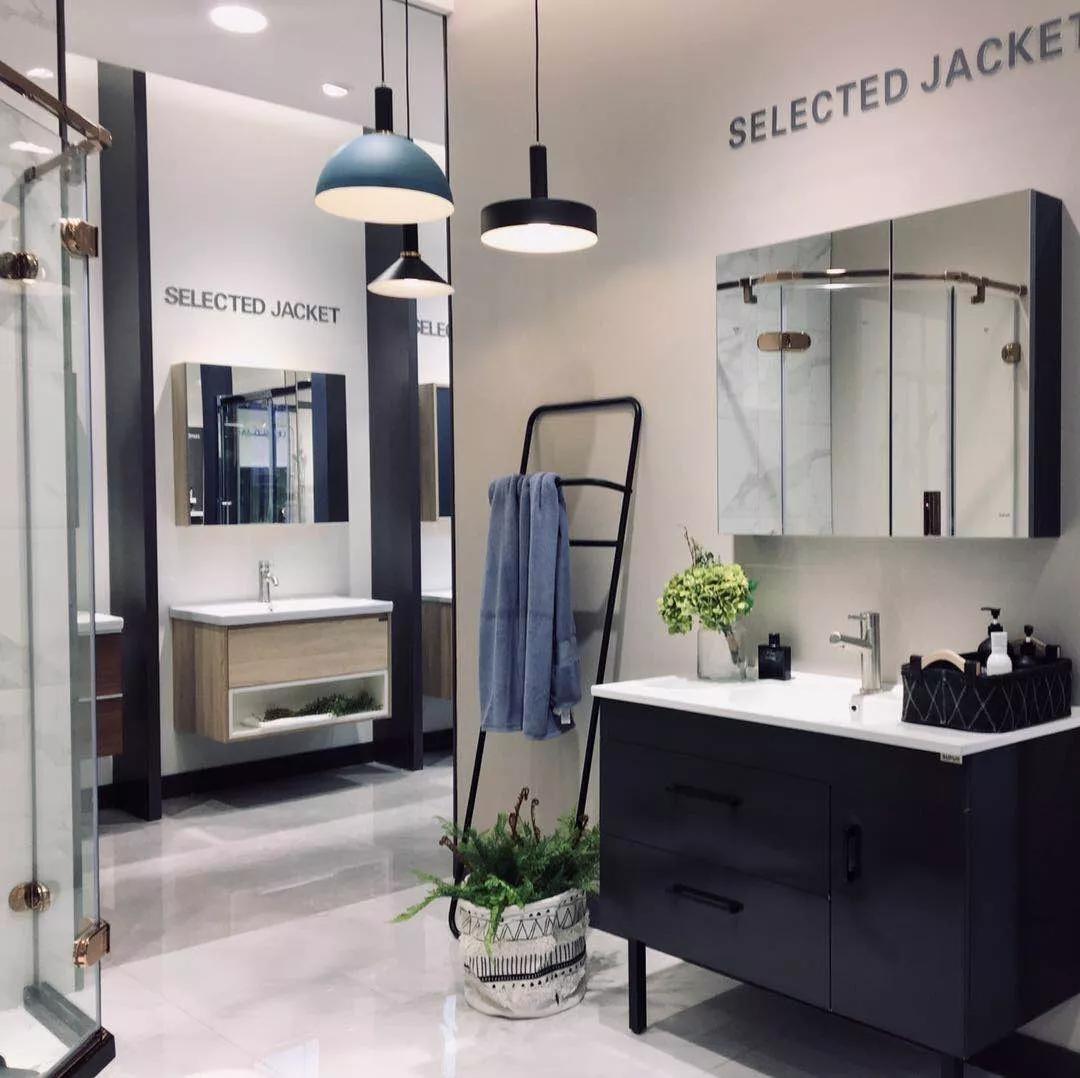 在厨房水槽区域的两侧我们可以看到多款浴室柜及浴室柜整装套间,不同的风格浴室柜结合不同的设计,演绎出不同的品位调性。