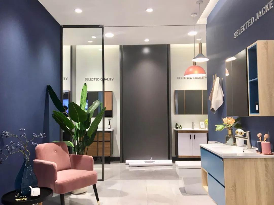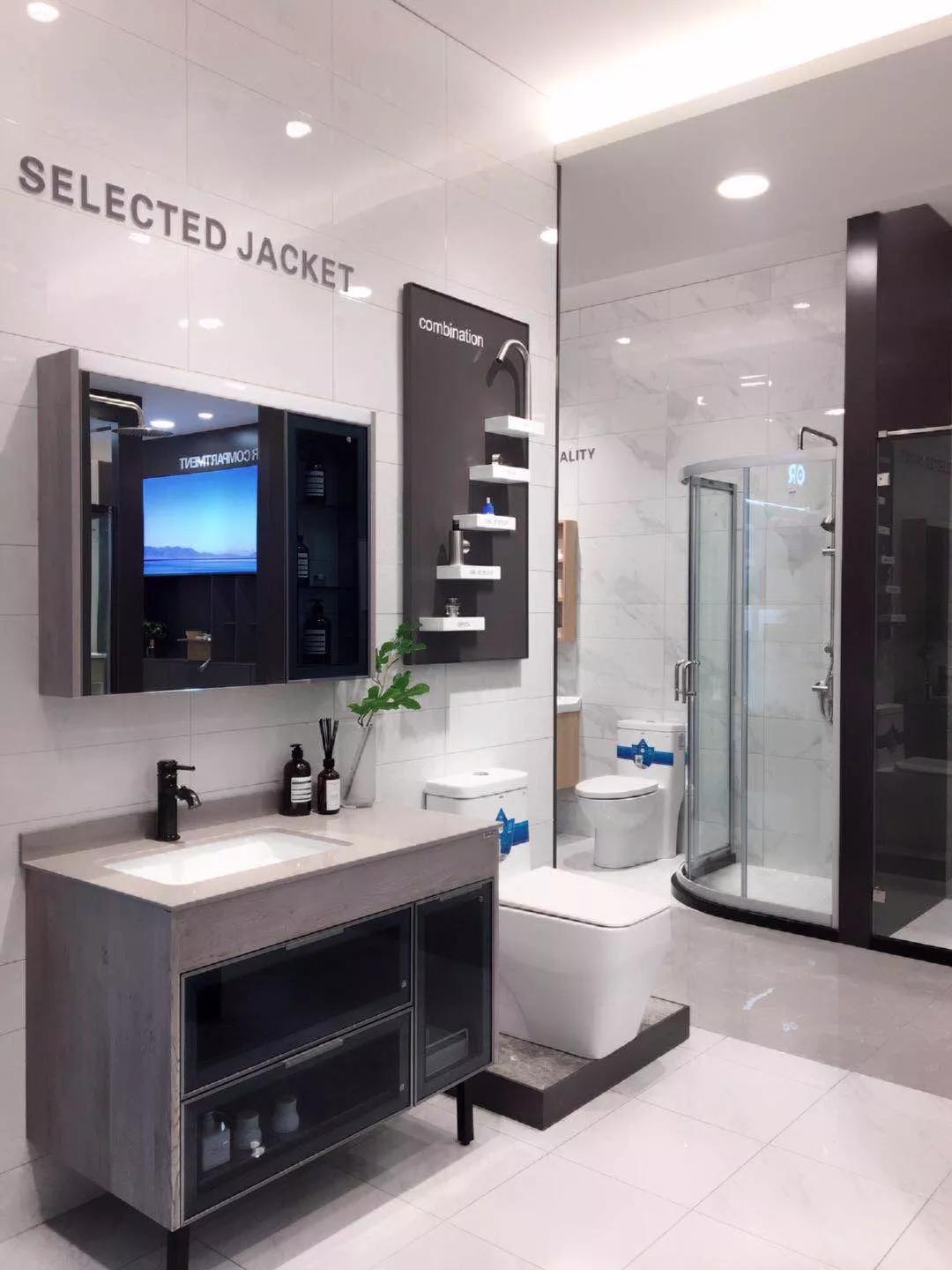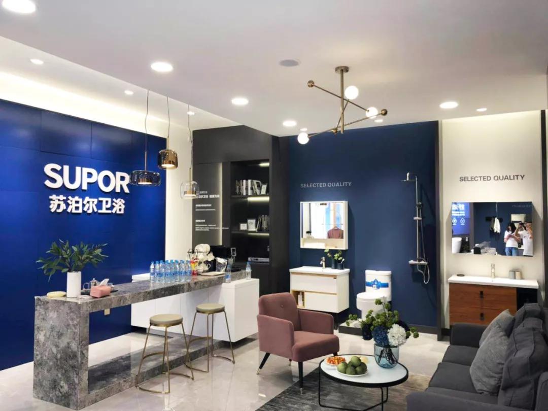 首先可以看到品牌蓝的“SUPOR苏泊尔卫浴”的门头,十分简约大气。橱窗展示了整体装修的组合套间,结合现代风浴室柜和智能马桶及五金配件打造,配以绿植点缀,完美呈现苏泊尔卫浴品牌和产品的调性。